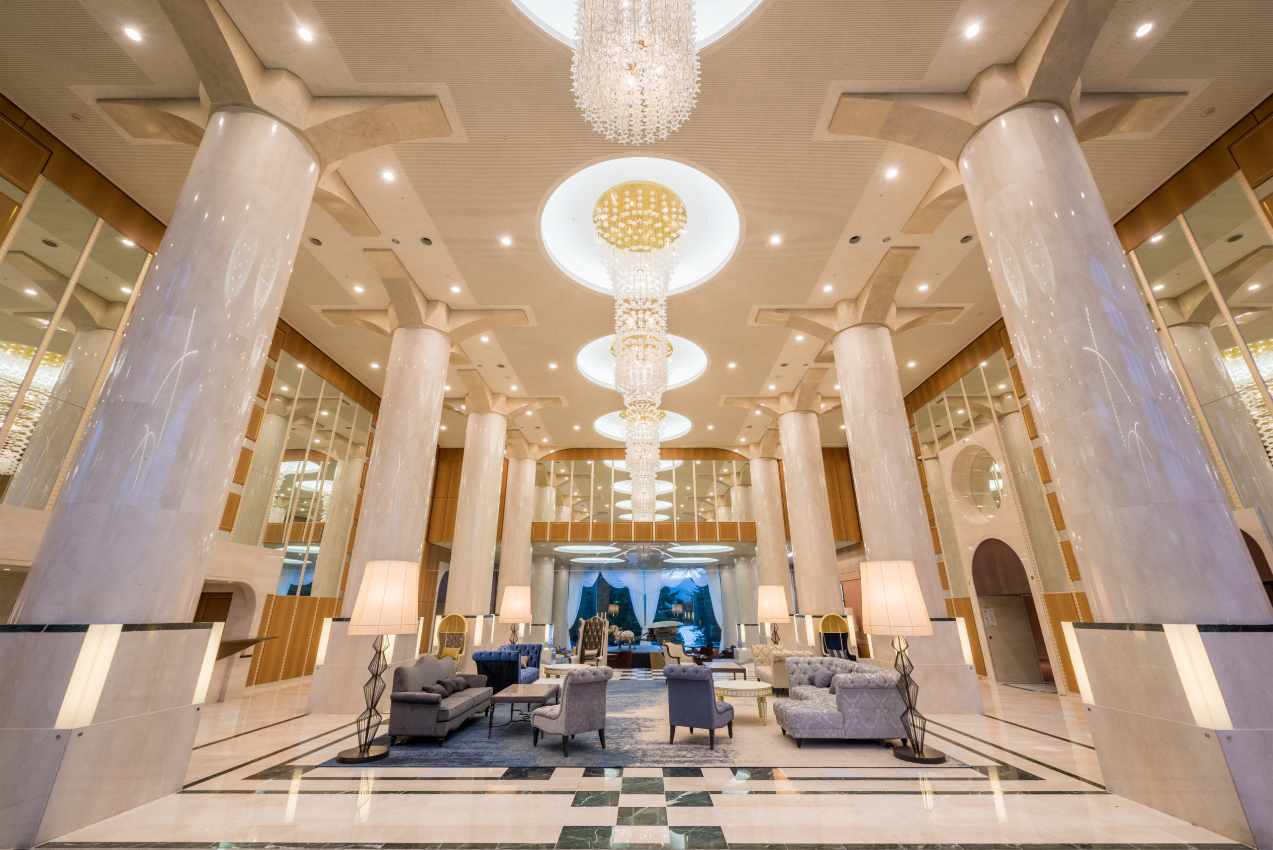 迎賓館猫魔離宮:高級感溢れる内装とインテリア、一流のアートに囲まれた、上質な空間でお寛ぎいただける、大人のラグジュアリーリゾートです。日常の喧騒から離れ、裏磐梯の雄大な自然に囲まれながら、美術品の数々をご覧いただきながら、ゆったりと流れる至福のひと時をお過ごしください。(迎賓館 猫魔離宮宿泊者専用露天風呂と五色の森のお風呂もご利用になれます)